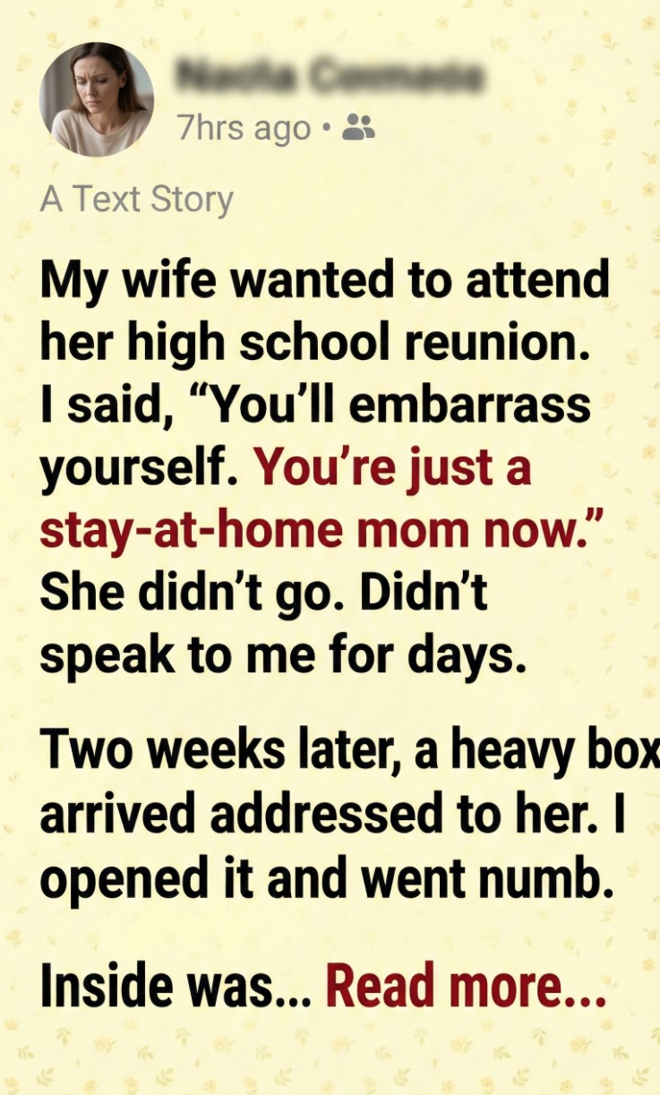 When she mentioned it, her eyes lit up in a way I hadn’t seen in years. She talked about old friends, teachers she admired, the version of herself she used to be—confident, ambitious, full of plans. And I ruined it. “You’ll embarrass yourself,” I said without even looking up from my phone. “You’re just a […]